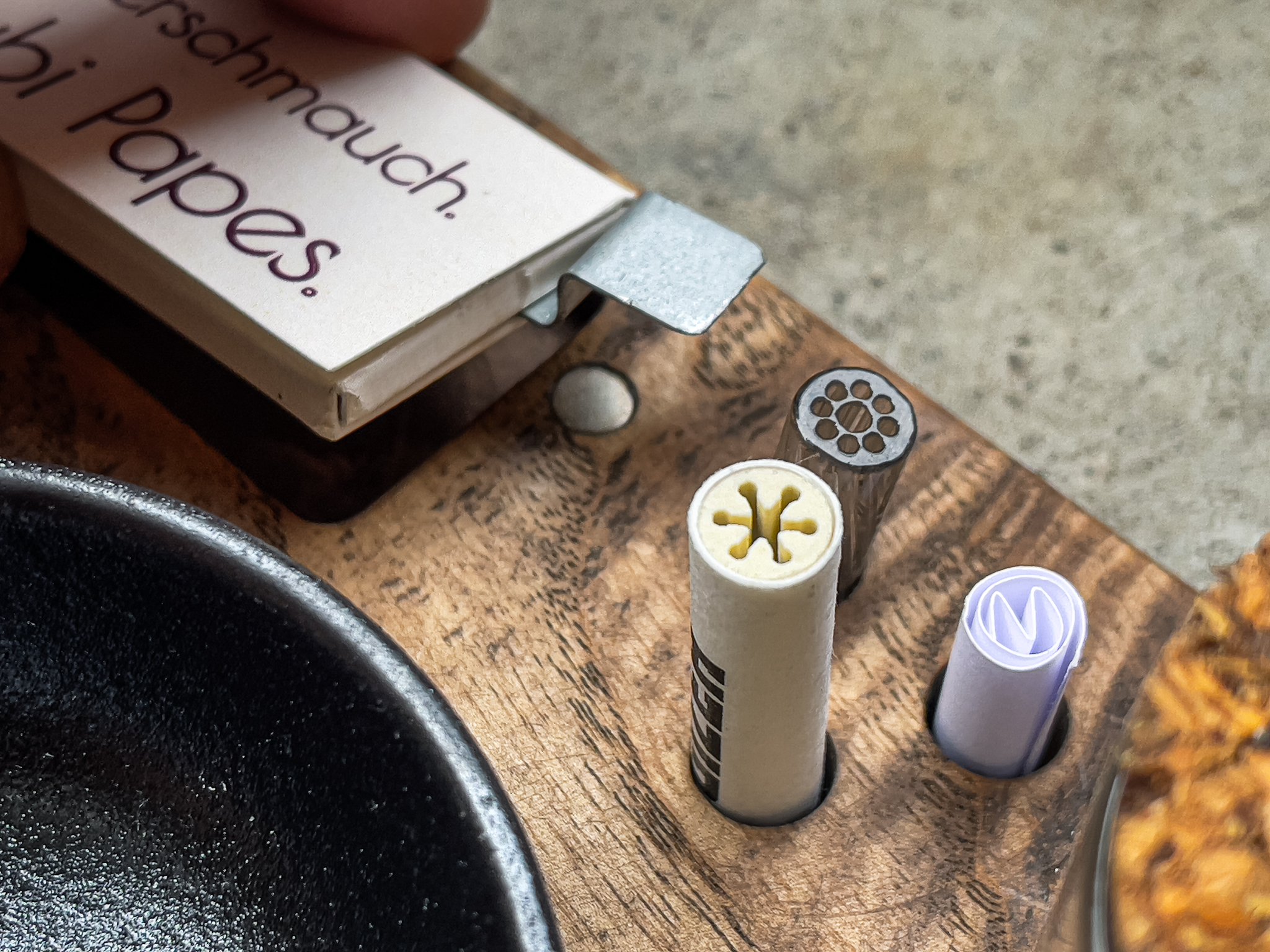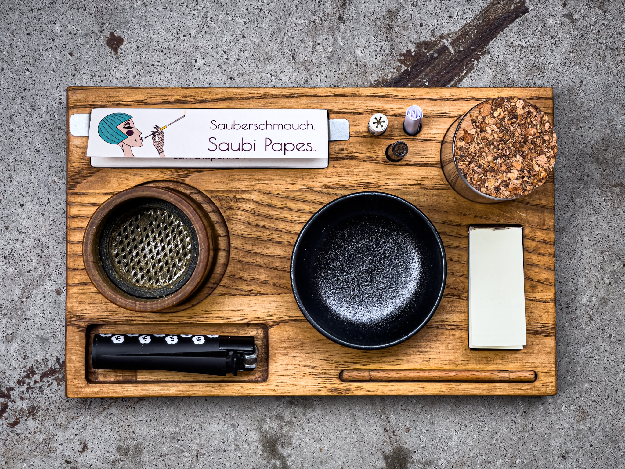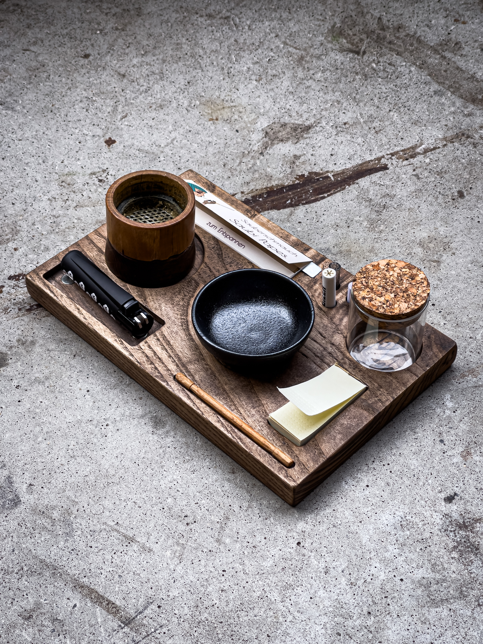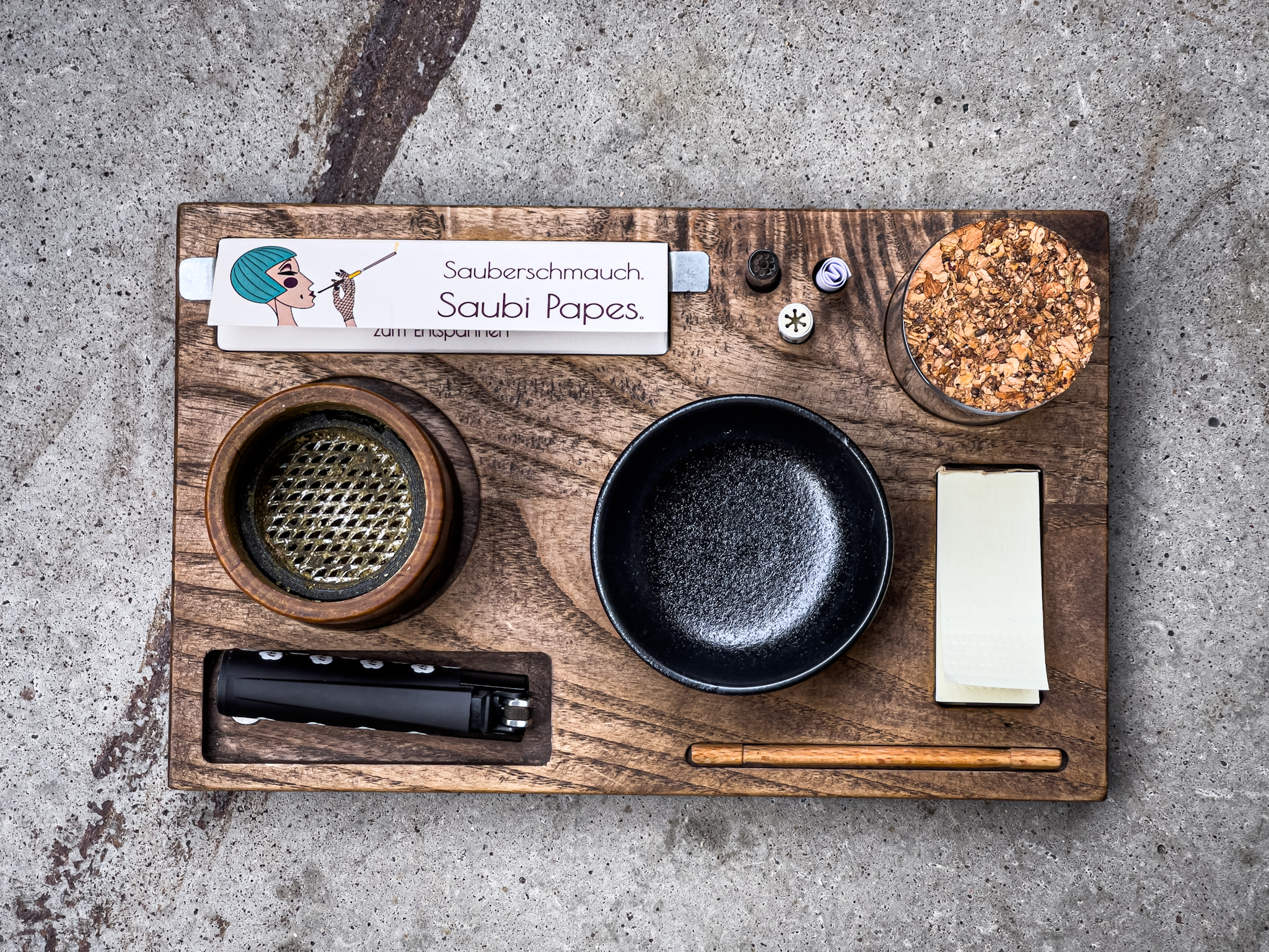 Mini rolling tray with magnetic system – made from ash wood • Grinder/crusher sockets: 40 mm; 50 mm; 63 mm • carbon filter sockets: Standard & Slim • magnetic sockets for papers, tips, lighter & mixing bowl • sockets for small stash jar • includes the jar, ceramic bowl, pack of tips & papers, magnetic counter pieces, tamper, 5 carbon filters and a certified cotton bag.