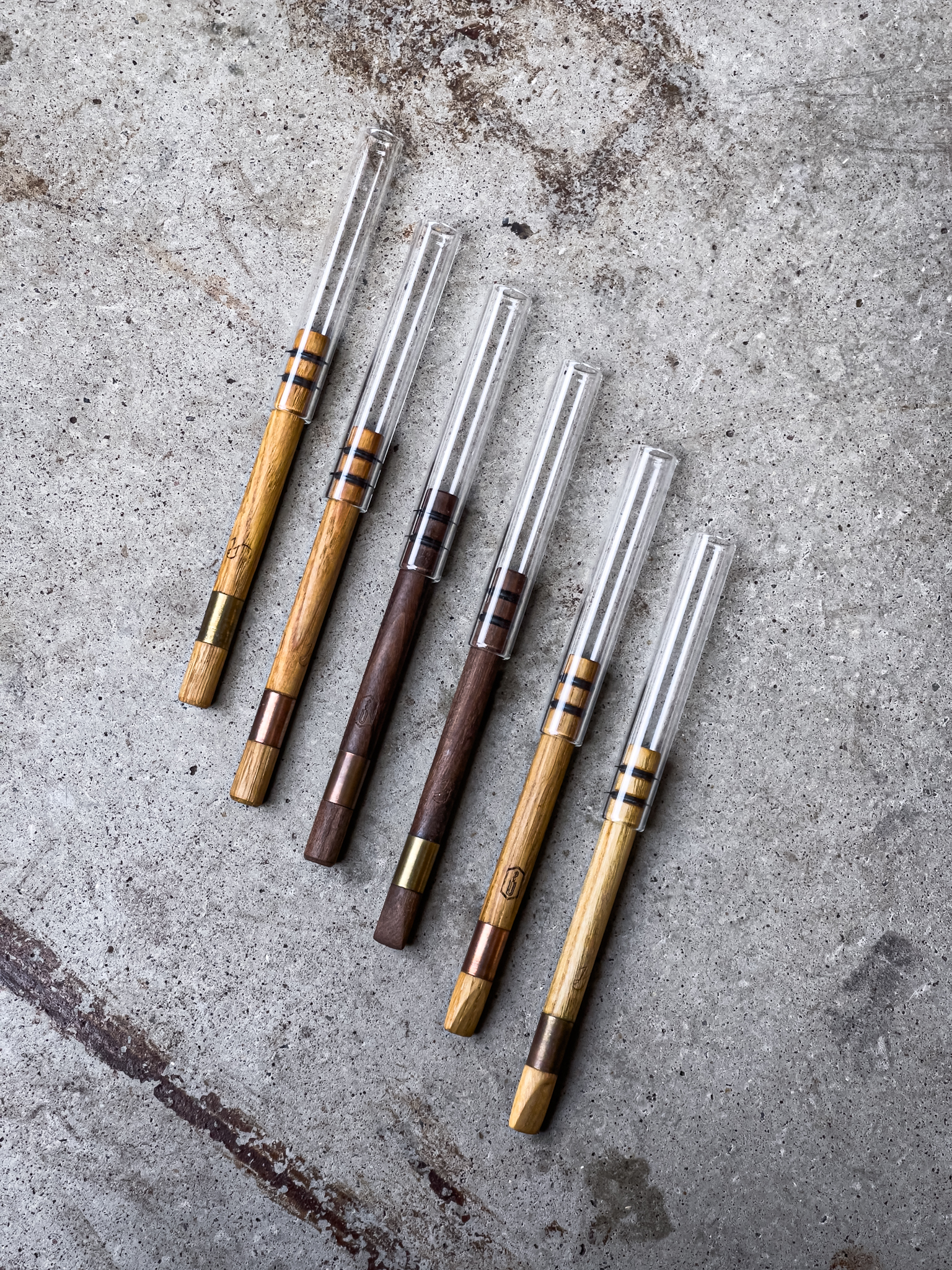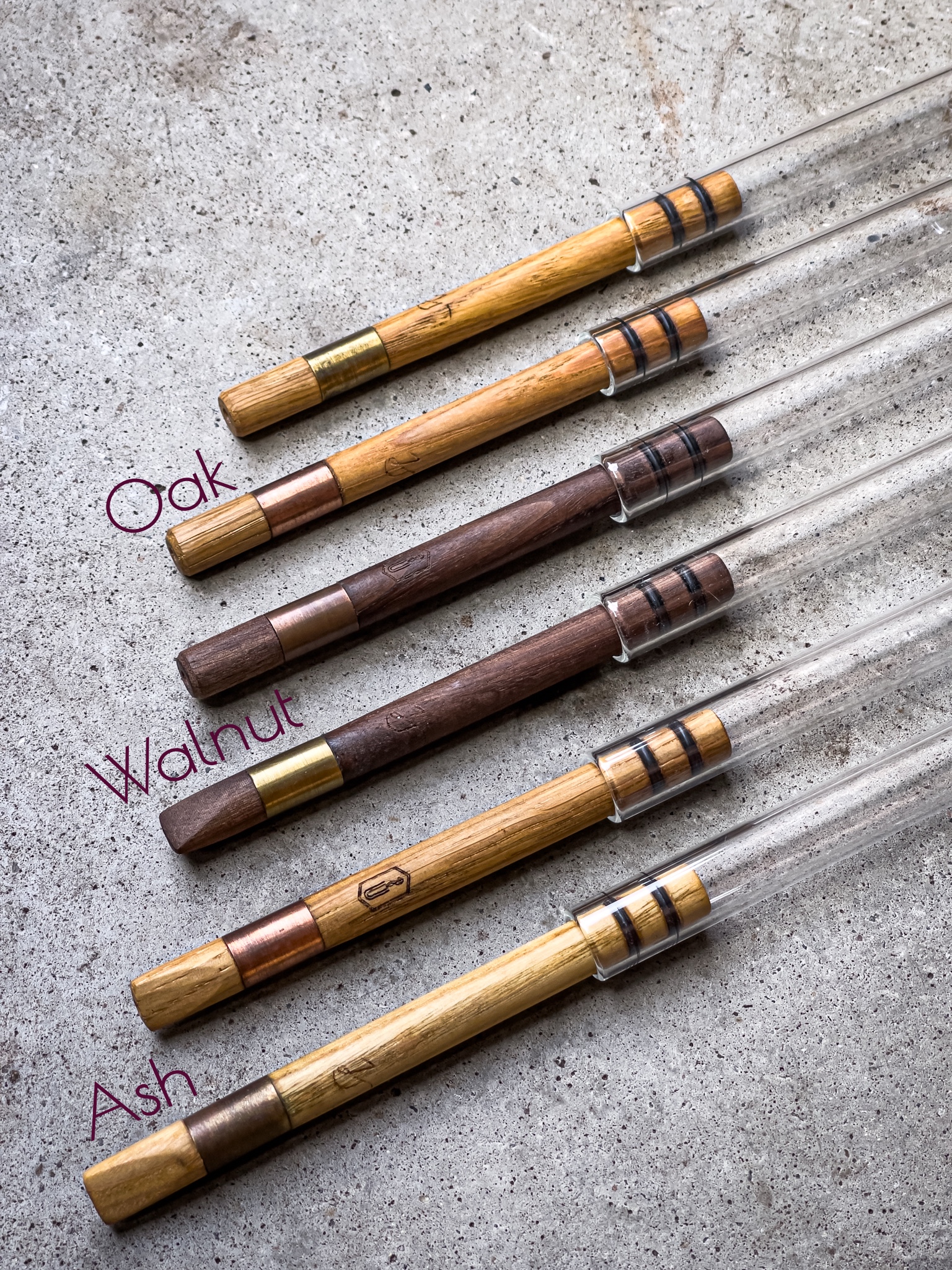 Choose from ash, black walnut and white oak wood, combined with either copper or brass for the body.